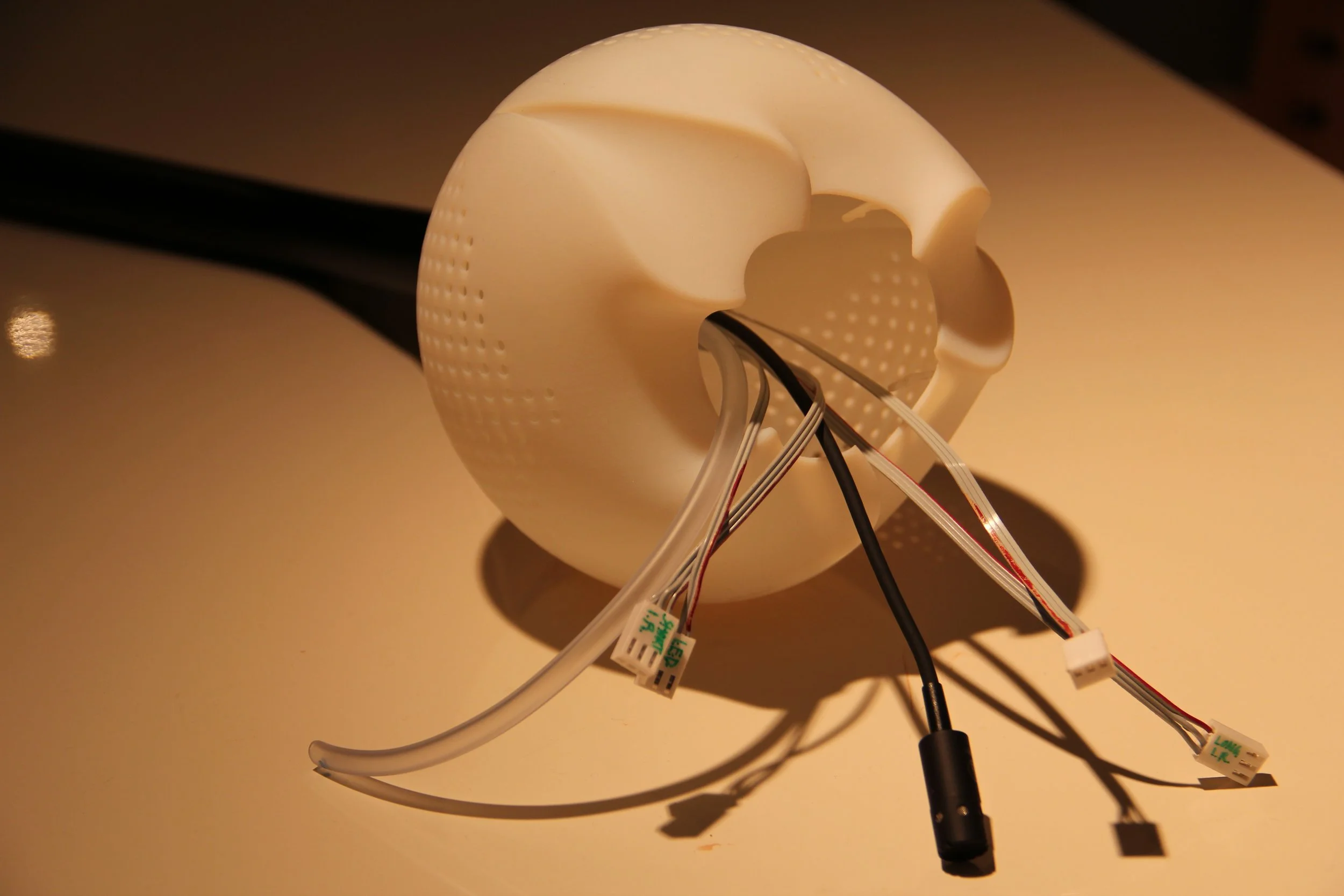 Lucid Dreams features 4 adjacent interactive sculptures designed to create a dream-like, synesthetic experience for the visitor. The exhibit is a reactive environment that changes as the visitor smells the perfumes. I worked to prototype and construct the installation over two months. I developed the sensor system and software to visualize the sound of the visitor breathing as he or she inhales the perfume. I used the minim sound library to process the audio input and identify the sound and shape of a sniff.