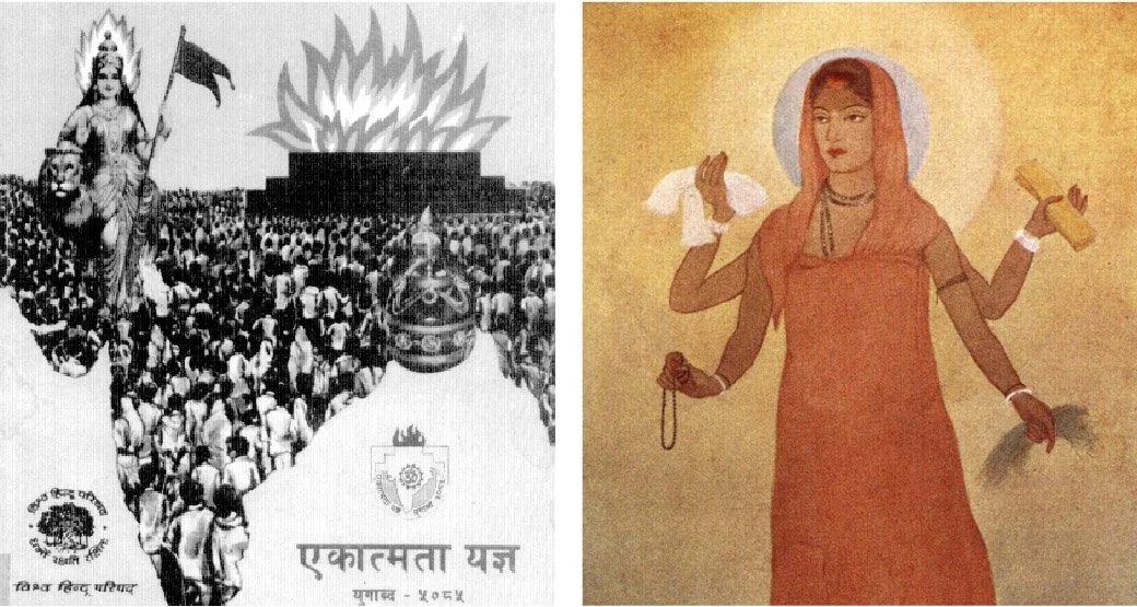 On the left: the cover of the Vishva Hindu Parishad’s “Sacrifice for Unity” souvenir volume.1983. Originally published in Hawley, John Stratton, and Donna Marie Wulff. “Bharat Mata.” DeviÌ„: goddesses of India. Berkeley: University of California Press, 1996. 255-257. Print. pg. 256. On the right: Mother India (detail) Abanindranath Tagore, 1905.