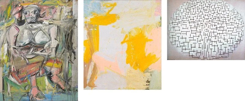 Left to right: Willem de Kooning, Woman 1, 1950-52, oil on canvas, Willem de Kooning, Rosy-Fingered Dawn at Louse Point, 1963, oil on canvas, Piet Mondrian. Composition No.10 (Pier and Ocean). Oil on canvas. 85 x 108 cm. 1915.
