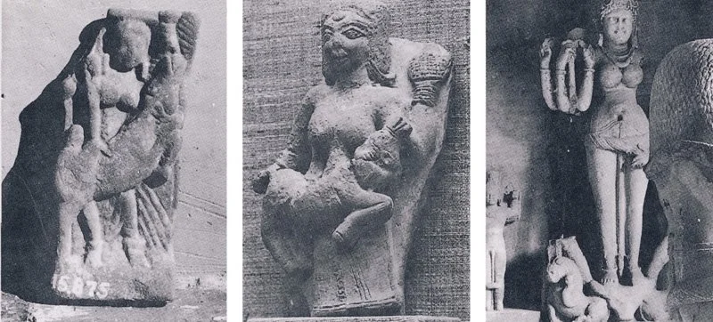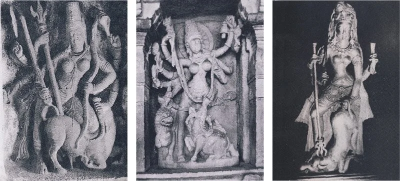 Sculptures of Mahishasura Mardini across India ranging from 1st - 5th Century CE. Images from The Divine and Demonaic by Carmel Berkson. Oxford University Press, 1995. plates #16, 17, and 20.