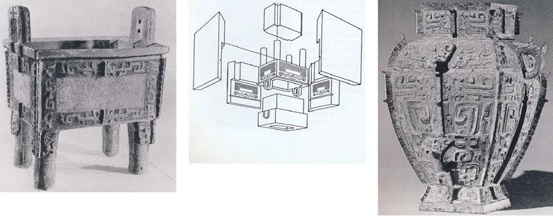 Large ritual vessels called Ding from the 12th Century BCE in China. The center image shows the casting process of these vessels, which uses modular molds to produce surface patterns in relief. Originally published in Ten Thousand Things, Module and Mass Production in Chinese Art by Lothar Ledderose, Princeton, NJ, Princeton University Press, 2000. pg. 27, 38, 37.