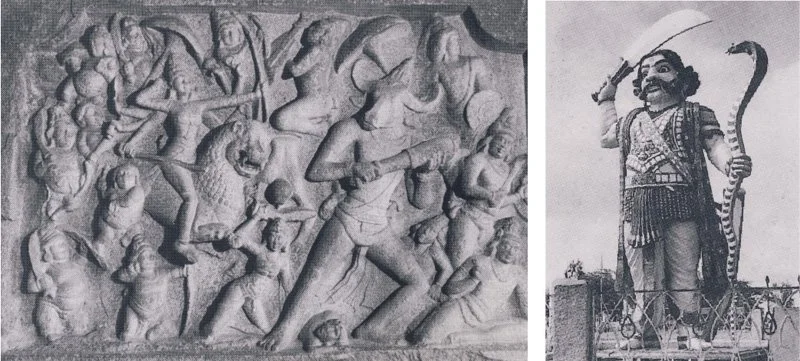 On the left is a relief of Mahisha fighting Durga from the 7th century CE at Mamallapuram in Tamil Nadu, and on the right a sculpture of Mahisha at Chamundi Hill in Mysore, Karnataka. The image on the left was originally published inThe Art of Ancient India by Susan and John C. Huntington, New York, Weatherhill 1985. page 302. The image on the right was originally published in The Divine and Demonaic: Mahisha's Heroic Struggle With Durga, by Carmel Berkson. Delhi: Oxford University Press, 1995. plate #9.